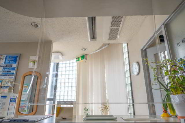 新型コロナウイルス対策として、受付のカウンター上に手作りのビニールシートを設置しました。