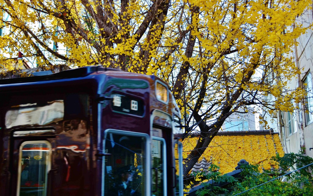 いつも利用する阪急淡路駅のホームから大きなイチョウの木が見えます。
