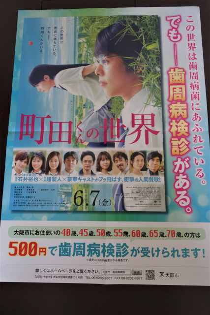 大阪市の歯周病検診と、映画「町田くんの世界」のタイアップのポスターが届きました。