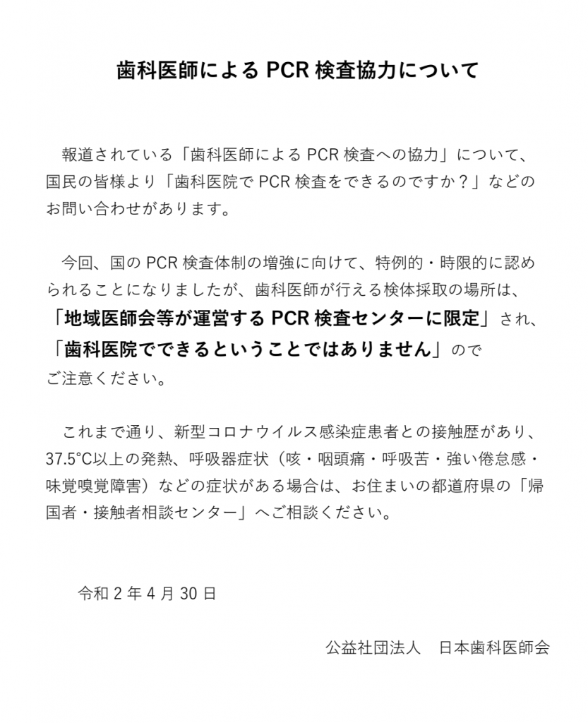 先日、新型コロナウイルスに感染しているのかを確認するPCR検査を、歯科医師にも認めるという報道がありましたが、当医院も含め歯科医院ではPCR検査は行っておりません。