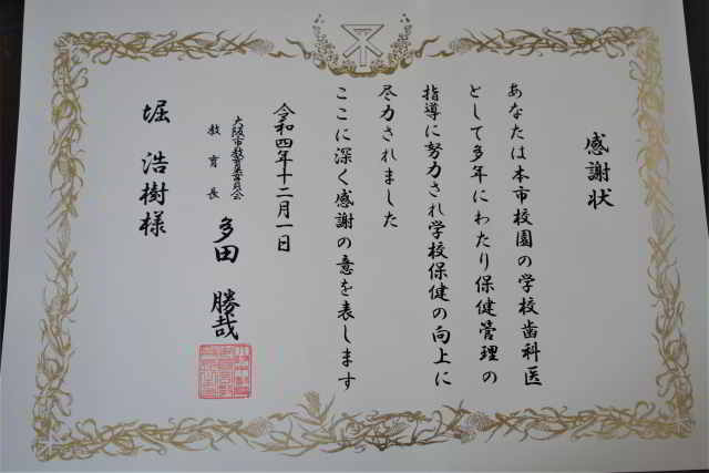 教育委員会から、今春退職した学校歯科医への感謝状を頂きました。