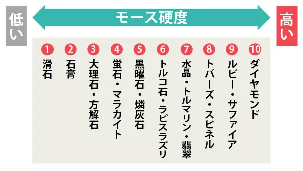 鉱物に対する硬さの尺度として10段階を定めた、モース硬度という基準があります。