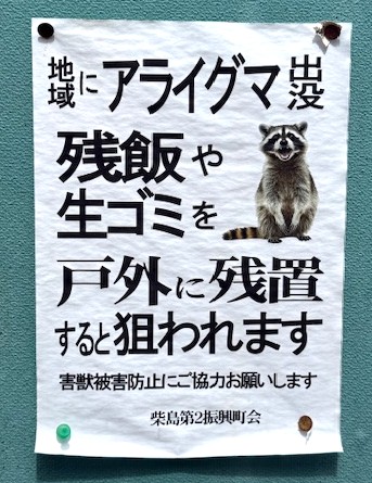 近所を散歩中、「地域にアライグマ出没」の張り紙を見ました。