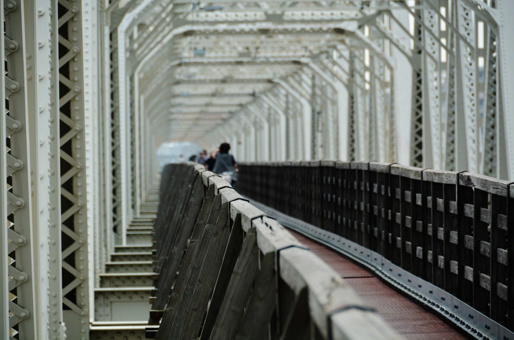 この橋は本来、城東貨物線の鉄道の橋なのですが、鉄道がこれまで単線で運行していたので、半分を歩道として地域の人々が利用してきました。