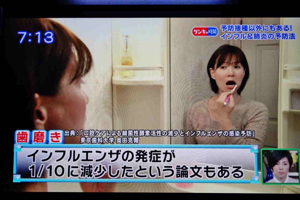 歯磨きをすることで、ウイルスを口腔内に定着する細菌を減少させることにより、インフルエンザの発症に有効であるという話をテレビで観ました。