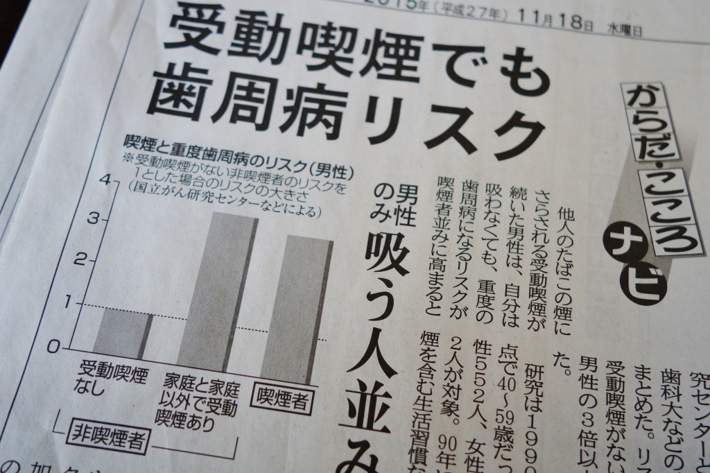 受動喫煙が続くと、重度の歯周病になるリスクが喫煙者並みに高まるとの研究が、国立がん研究センターと東京医科歯科大などのチームから発表されました。